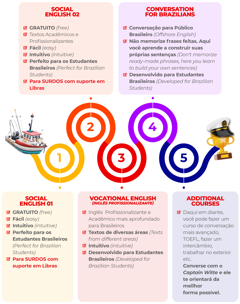 Captain Witte® e sua equipe (team) recomendam que você siga a seguinte sequência de cursos. Pensamos ser a forma mais apropriada (appropriate) para você alcançar a sonhada fluência (fluency) no inglês.
